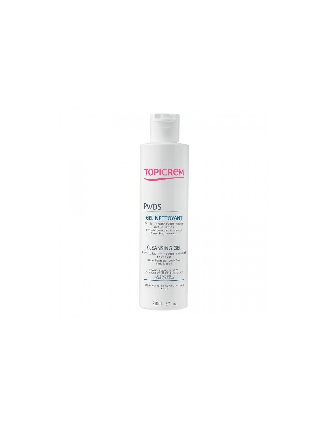 TOPICREM | 3700281702699TOPICREM PV/DS Gel nettoyant Purifie et facilite l'élimination de squames Corps et cuir chevelu Hypoallergénique, sans savon Convient aux peaux squameuses et cuirs chevelus pelliculés 200ml PV/DS Gel Nettoyant est un produit d’hygiène spécialement adapté aux peaux à tendance desquamante. Formulé à base de Piroctone Olamine (1%), il facilite le détachement des squames, permet de ralentir leur apparition, favorise l’élimination des pellicules et contribue au confort de la peau. Il nettoie en douceur, laisse la peau hydratée, respecte apaise et protège. Il apaise les sensations d’inconfort et est adapté aux muqueuses sensibles. Testé sous contrôle dermatologique et gynécologique.