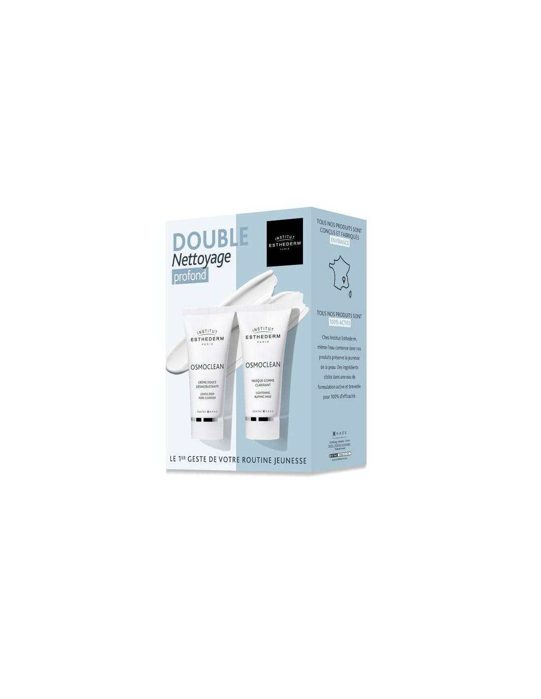 Institut Esthederm vous présente le Coffret Osmoclean. Retrouvez toute l'expertise du nettoyage professionnel Institut Esthederm à domicile, pour une peau nettoyée en profondeur, tout en douceur avec notre duo iconique : la Crème Douce Désincrustante & le Masque Gomme Clarifiant. 2 étapes clés pour une peau revitalisée et saine : 1. J'utilise la Crème Douce Désincrustante pour nettoyer la peau en profondeur grâce à un soin sans grain, efficace et doux pour préserver l'équilibre de ma peau. 2. J'utilise le Masque Gomme Clarifiant pour éclaircir et uniformiser mon teint. Grâce à son double pouvoir nettoyant d'un masque-crème et d'un gommage sans grain, il élimine instantanément les cellules mortes et impuretés qui ternissent l'éclat de la peau.